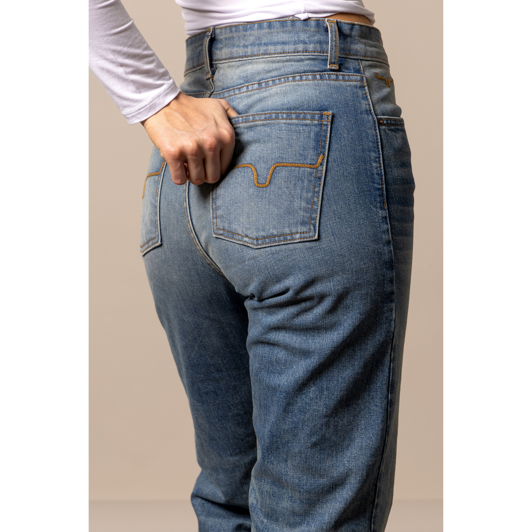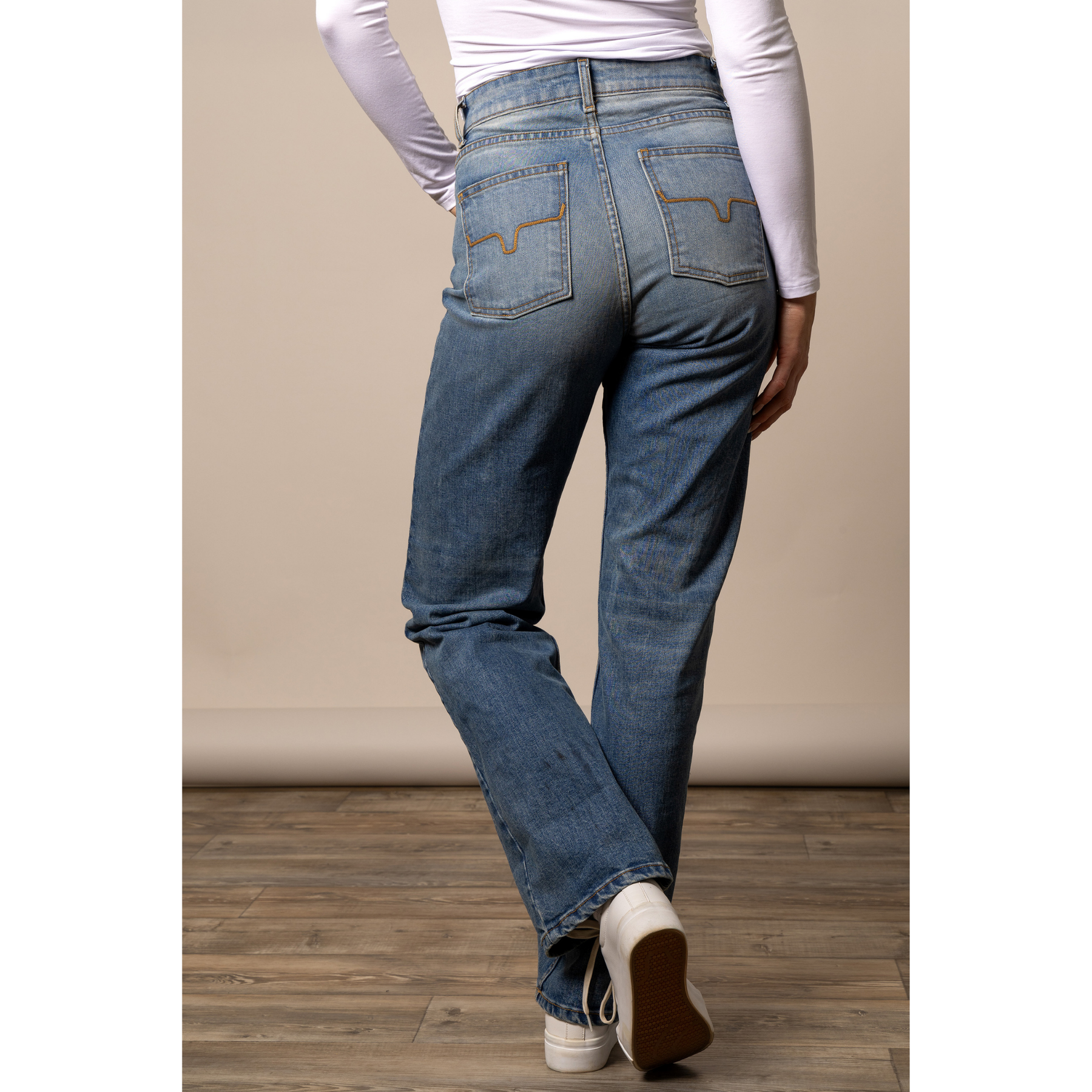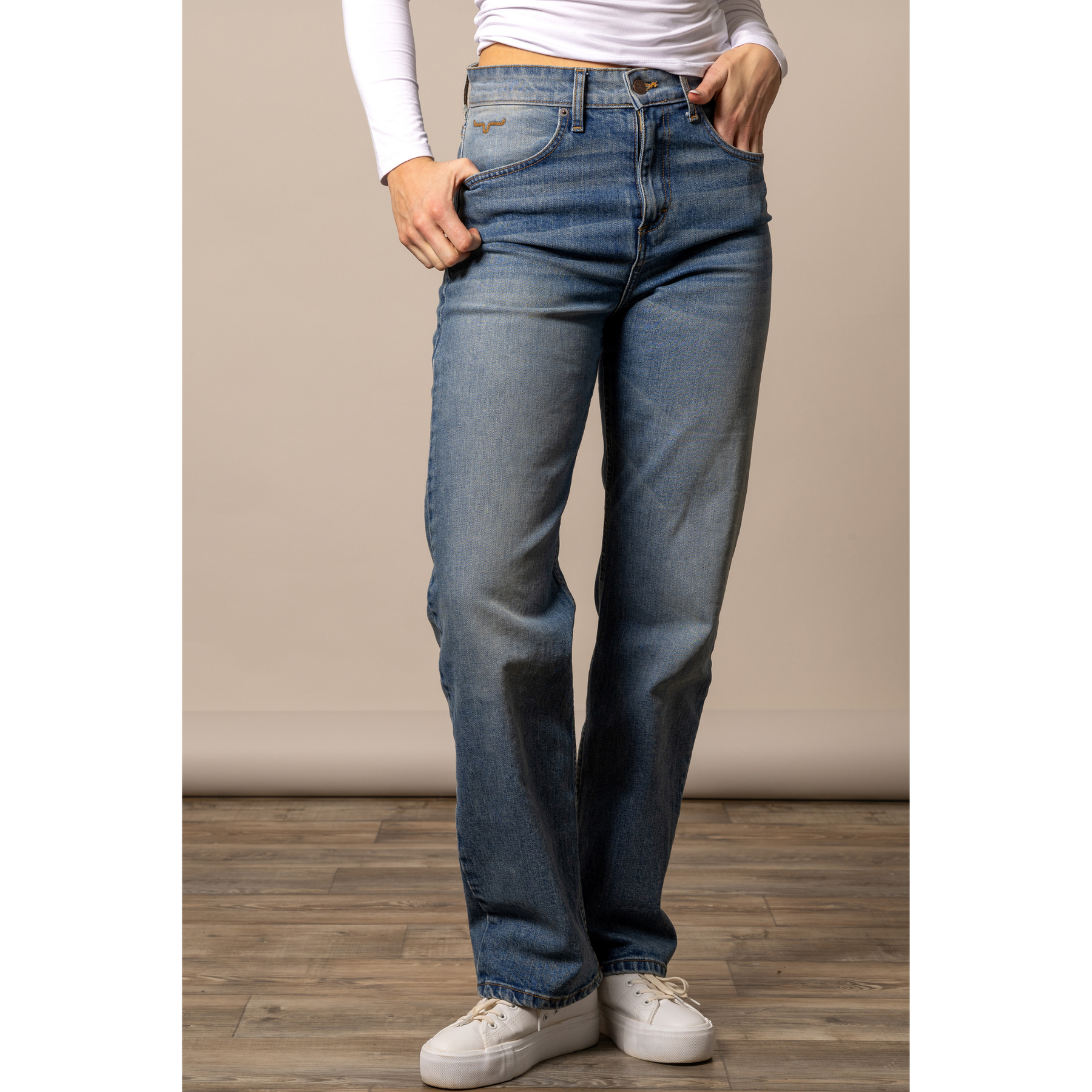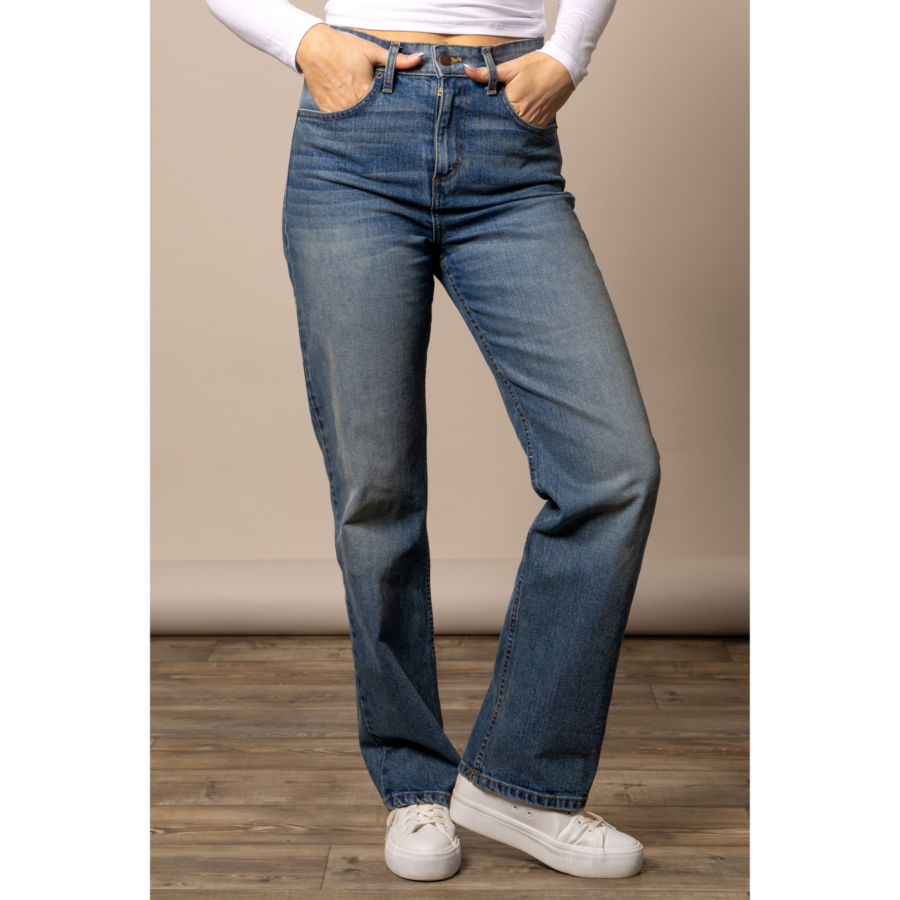 High-rise, loose fitting straight leg, featuring a boot size opening.